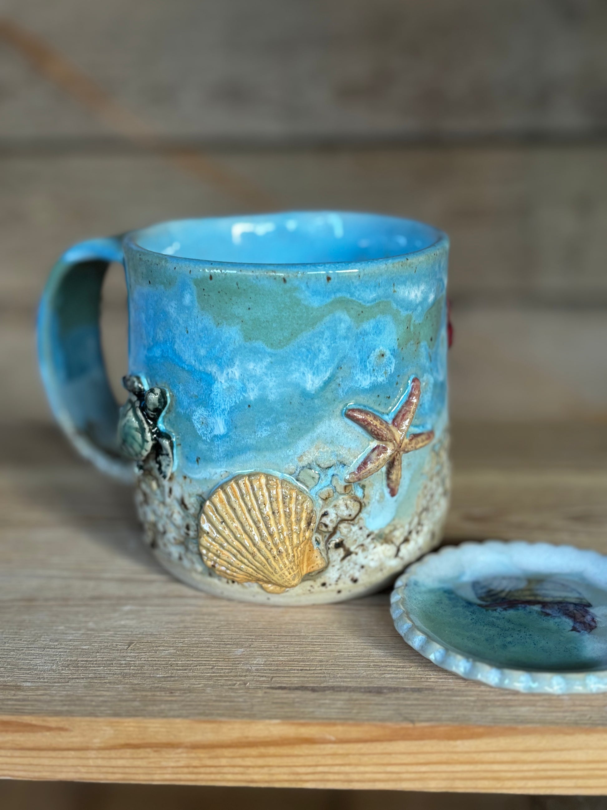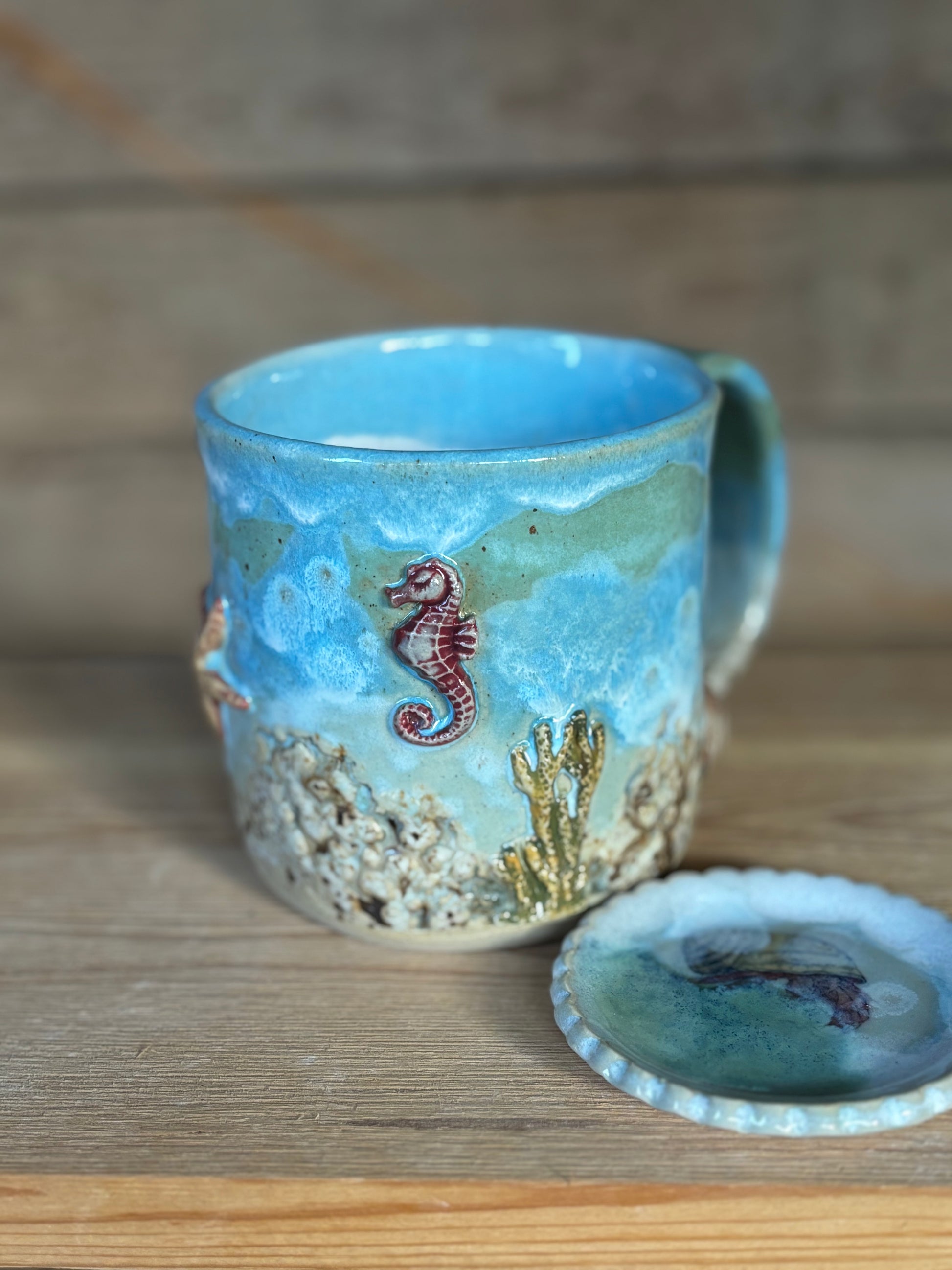 Hrnek s mořským motivem zdobený reliéfy želvy, mušlí a korálů. Textura vznikla pomocí silikonových forem a otisků, glazury byly nanášeny v několika vrstvách pro dosažení jemných přechodů barev. Součástí sady je i malý talířek ve stejném stylu.