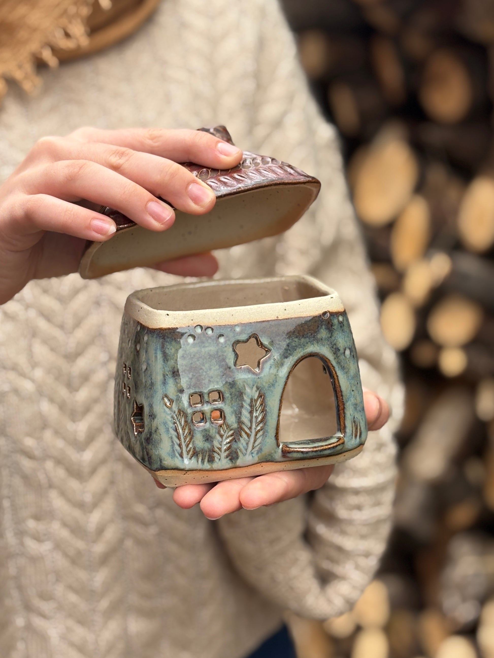 Handmade ceramic house designed for a tealight, incense cone, or scented tree. When lit, the soft glow shines through the windows and gentle smoke escapes through the chimney - like a tiny home glowing in autumn light.