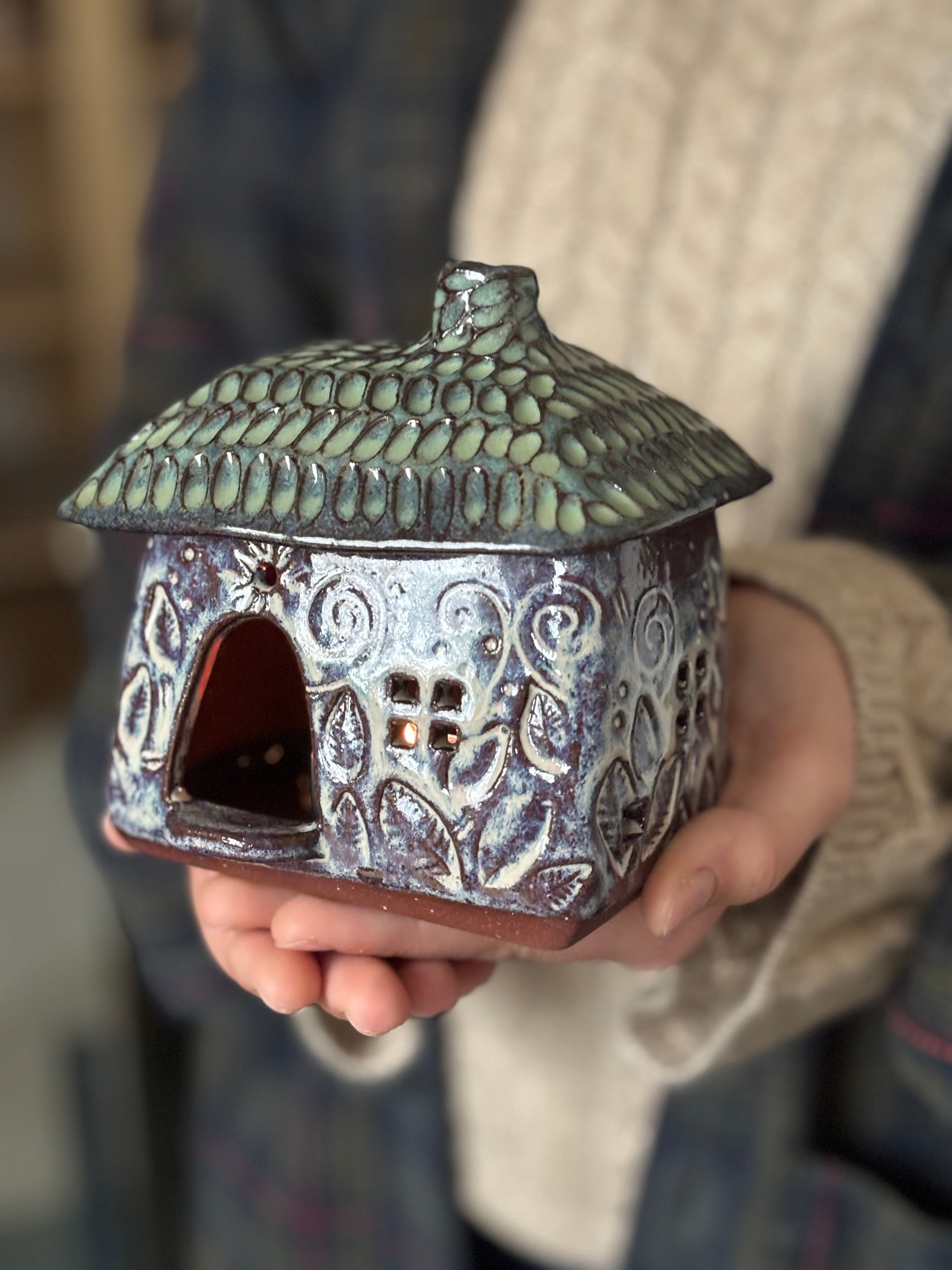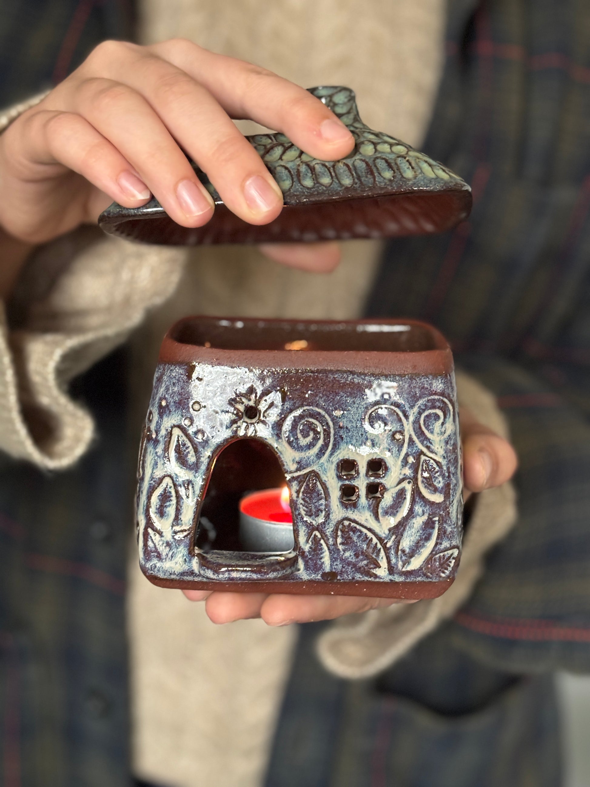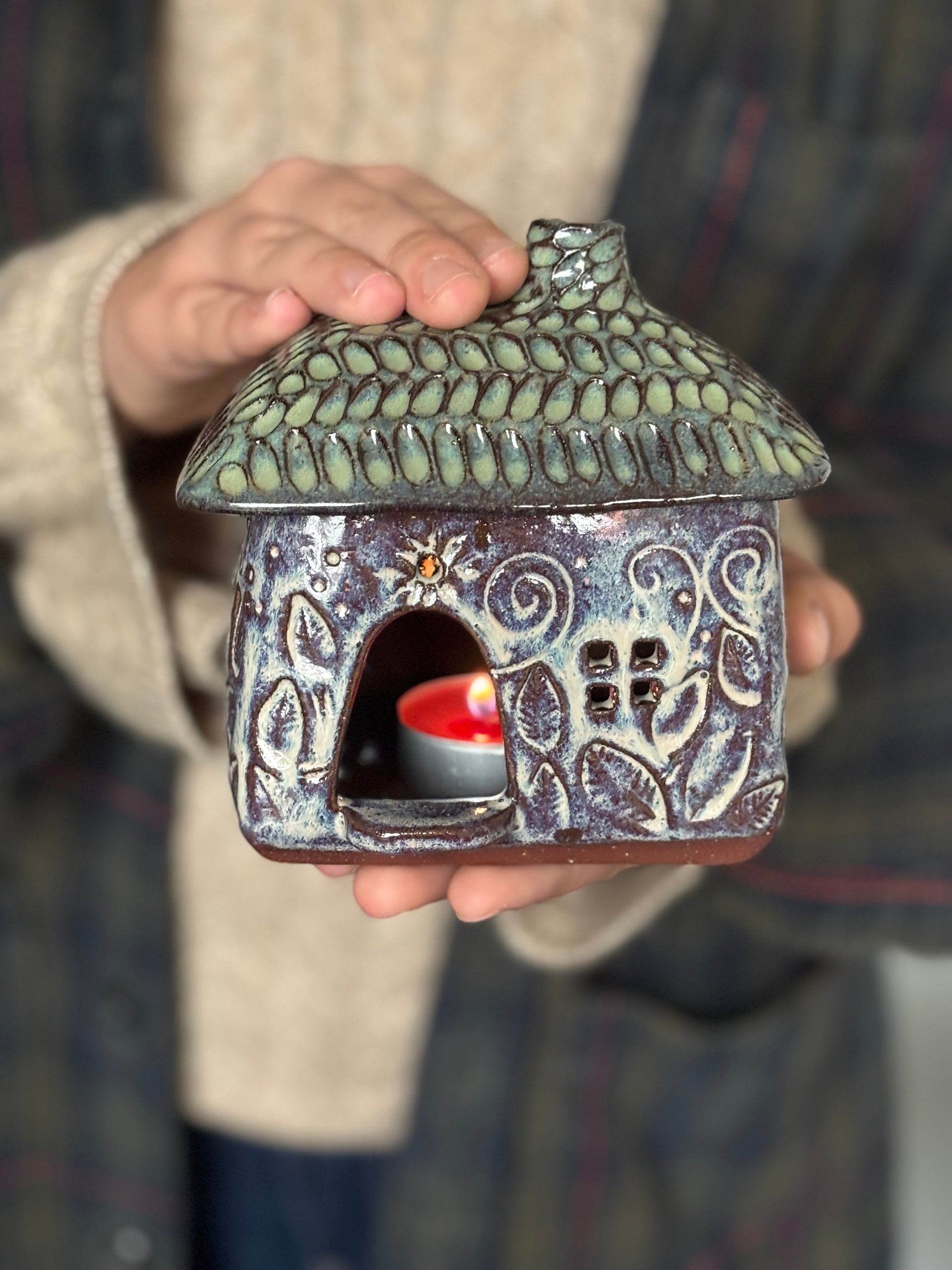 Handmade ceramic house designed for a tealight, incense cone, or scented tree. When lit, the soft glow shines through the windows and gentle smoke escapes through the chimney - like a tiny home glowing in autumn light.