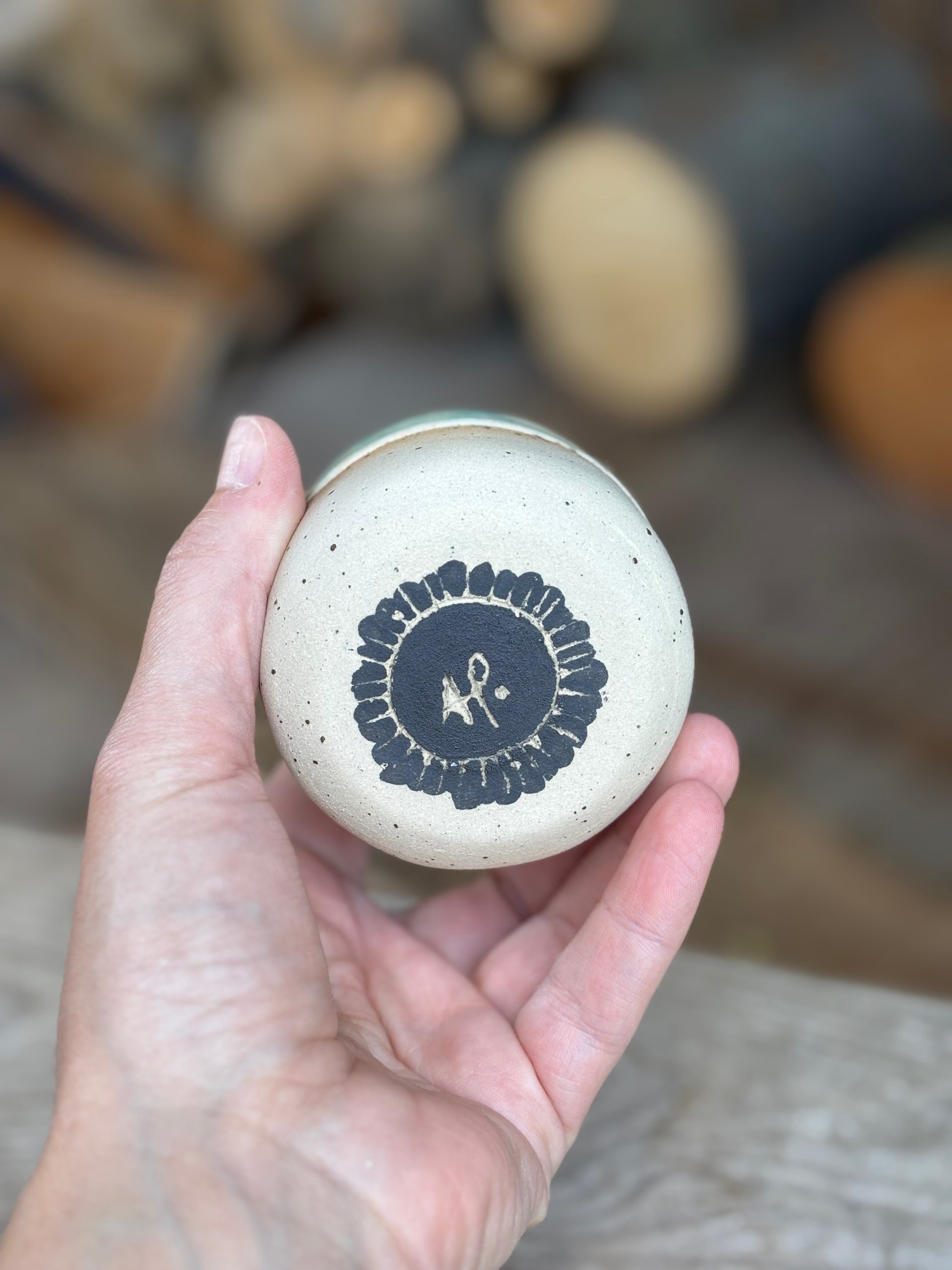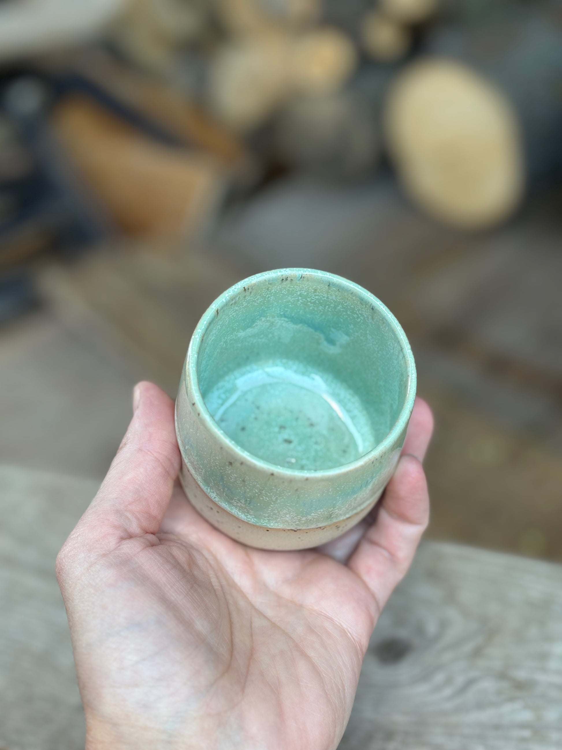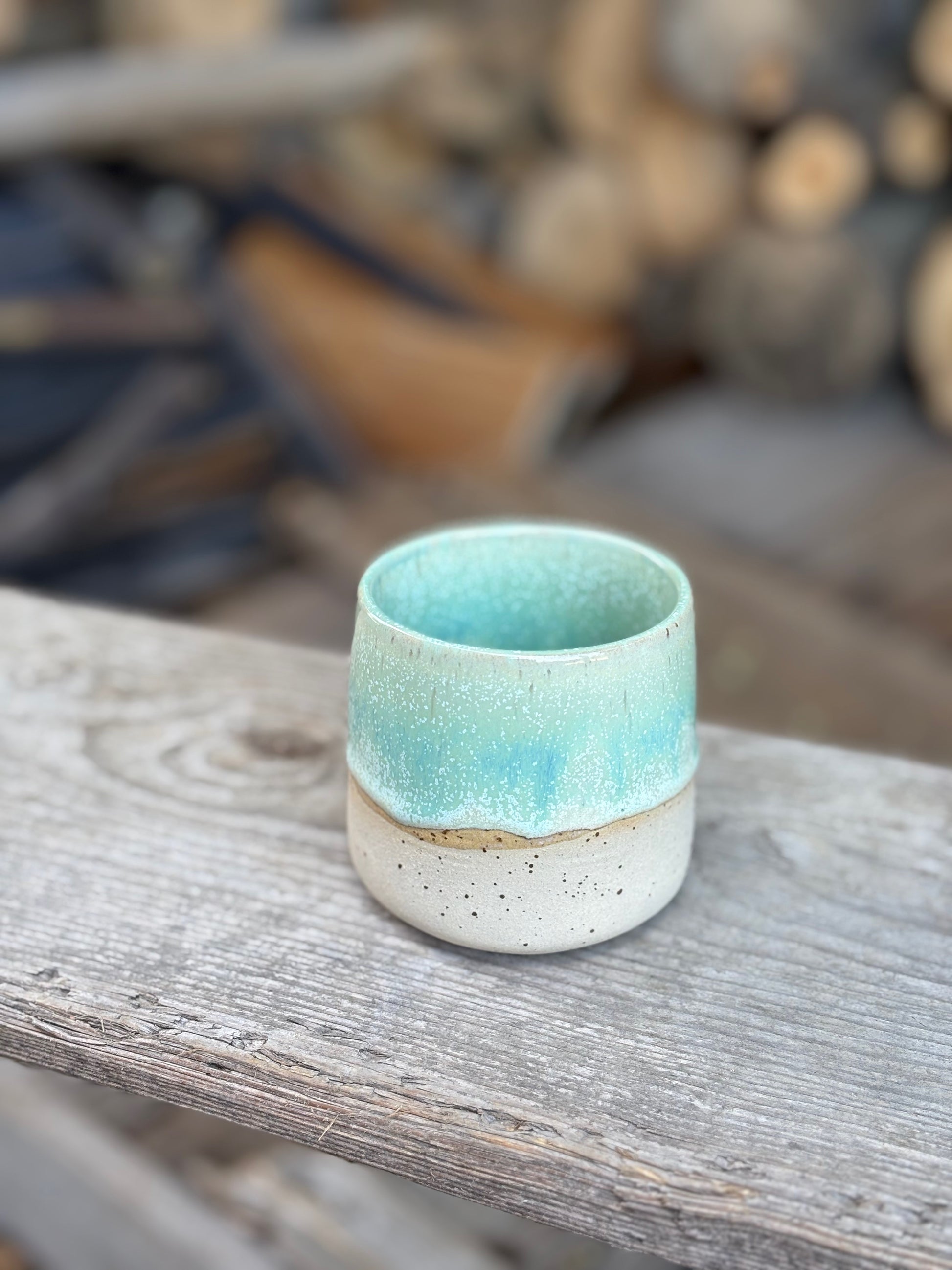 Handleless cup with soft glaze in turquoise and sandy beige tones, creating a natural gradient reminiscent of sea and shore.