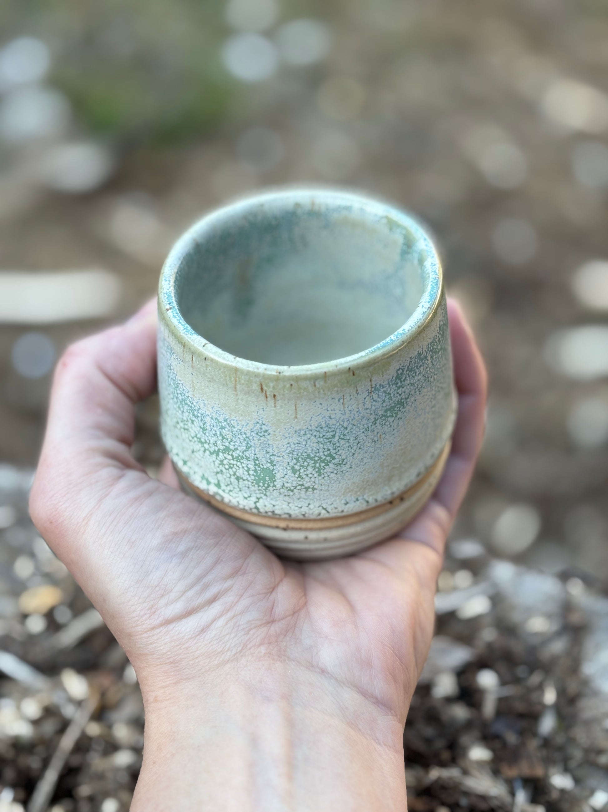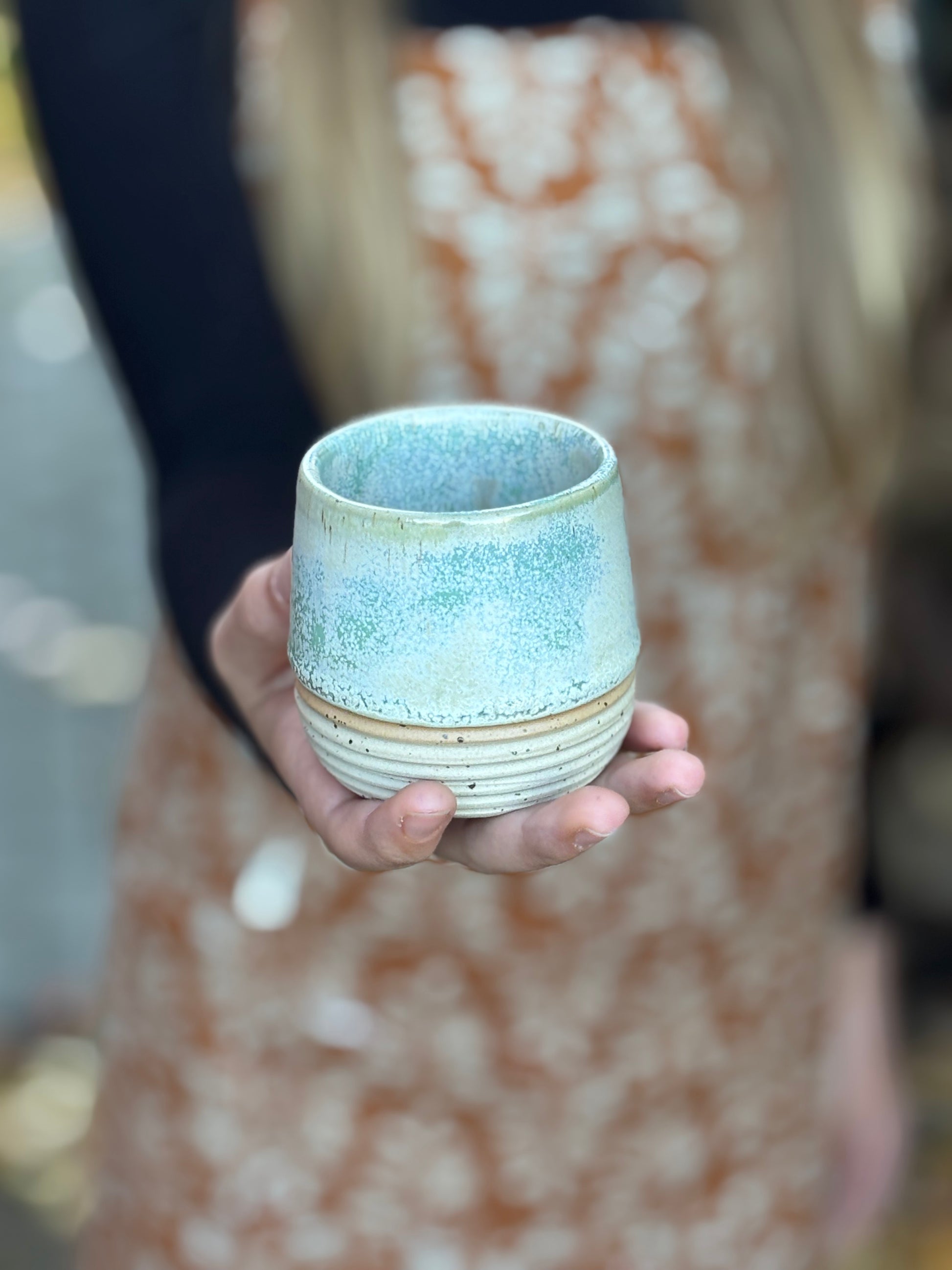 Handleless cup combining a matte glaze in soft misty blue and green tones with a natural clay base. The fine speckled surface and carved lower part give it a calm, minimal feel inspired by nature.