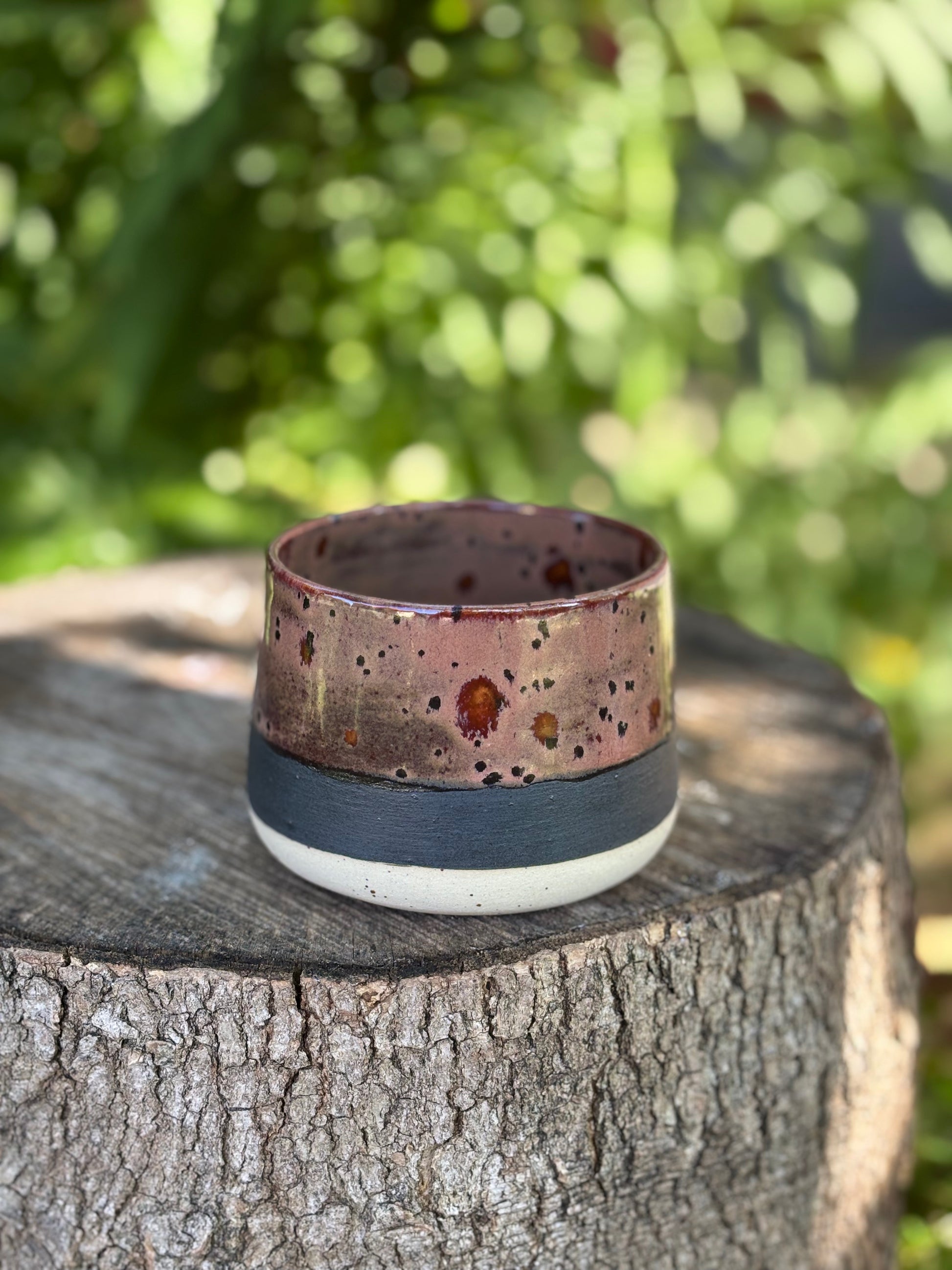 Handleless cup with glossy glaze in peppered plum tones, contrasted by a matte black band and raw clay base.