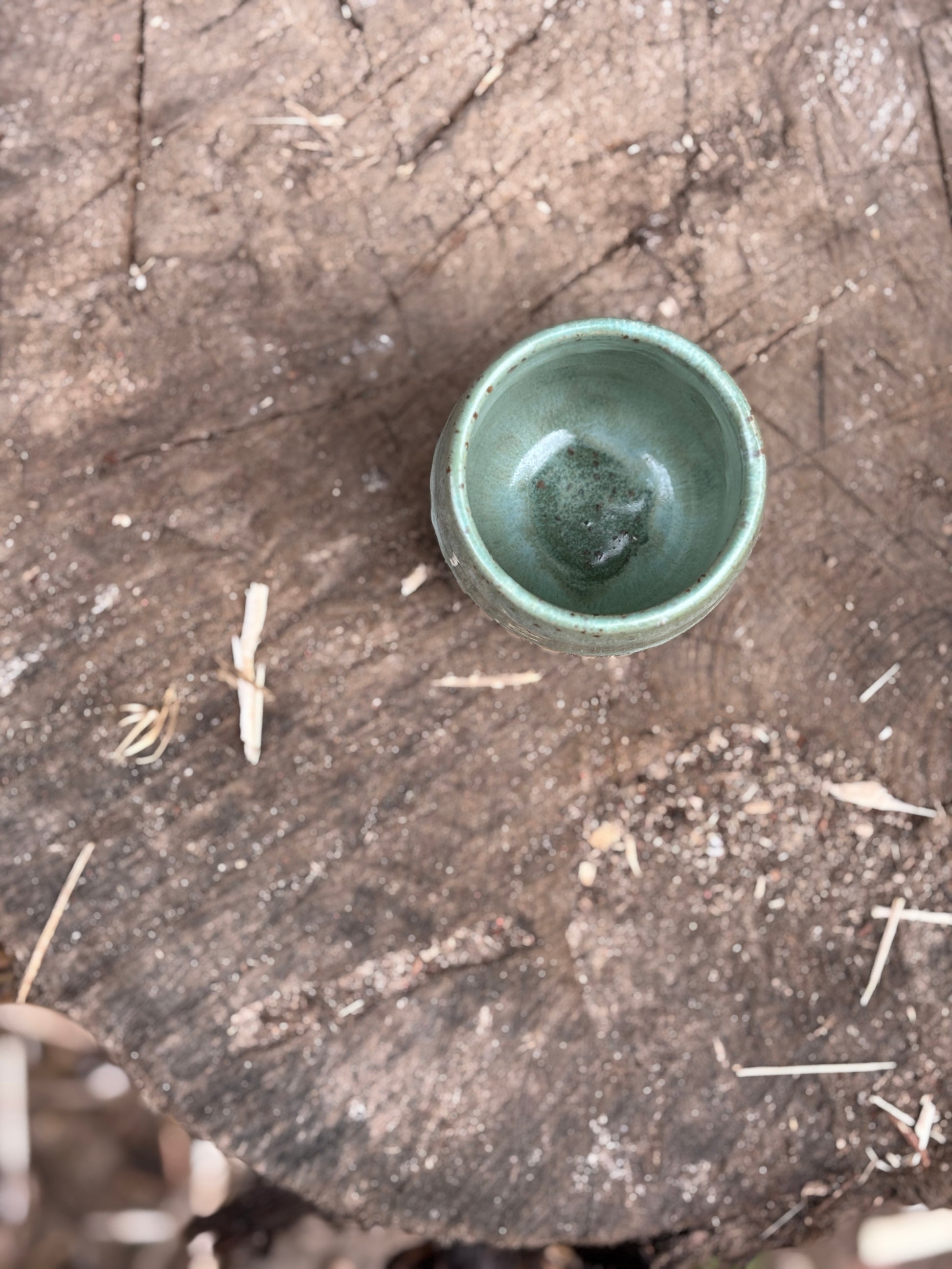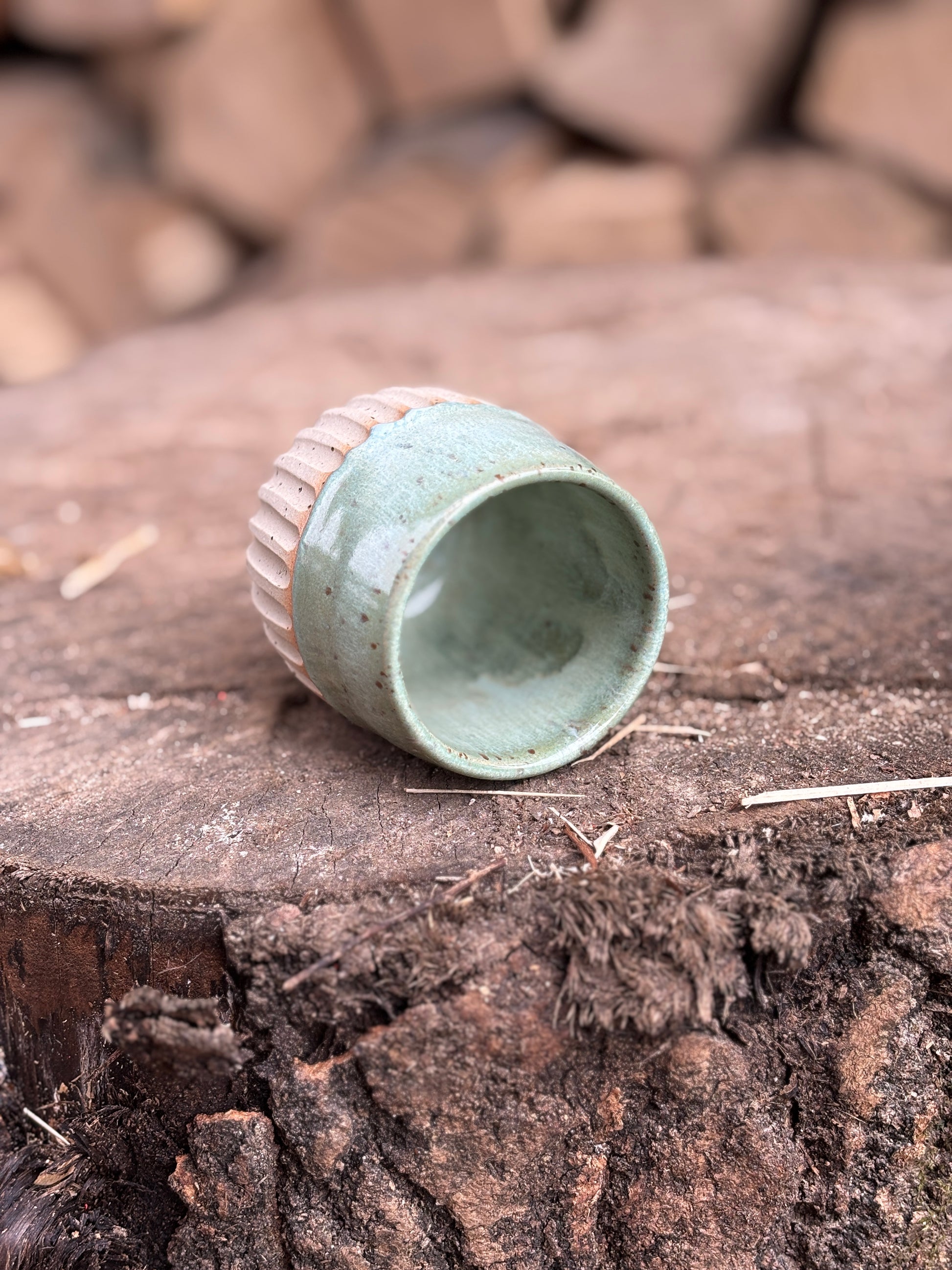 Handleless cup in soft sage green tones flowing over a carved sandy clay base. The gentle color transitions and tactile lower texture give it a calm, organic look inspired by nature.