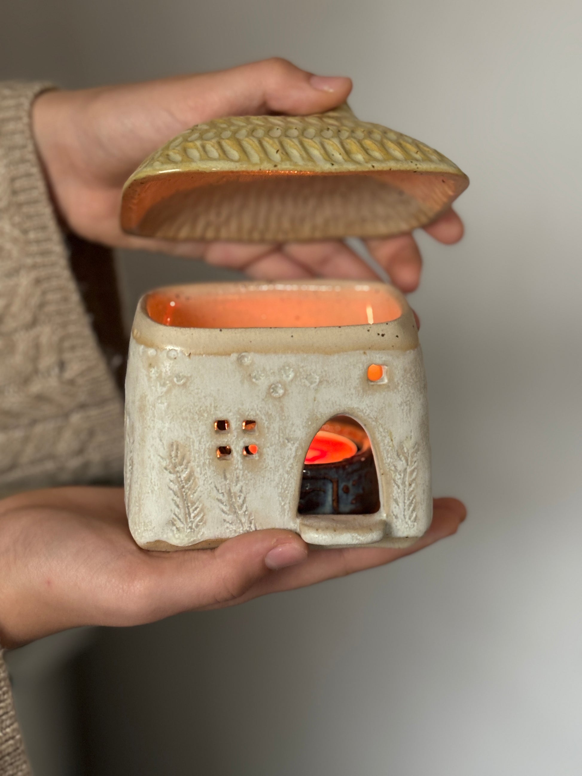 Handmade ceramic house designed for a tealight, incense cone, or scented tree. When lit, the soft glow shines through the windows and gentle smoke escapes through the chimney - like a tiny home glowing in autumn light.