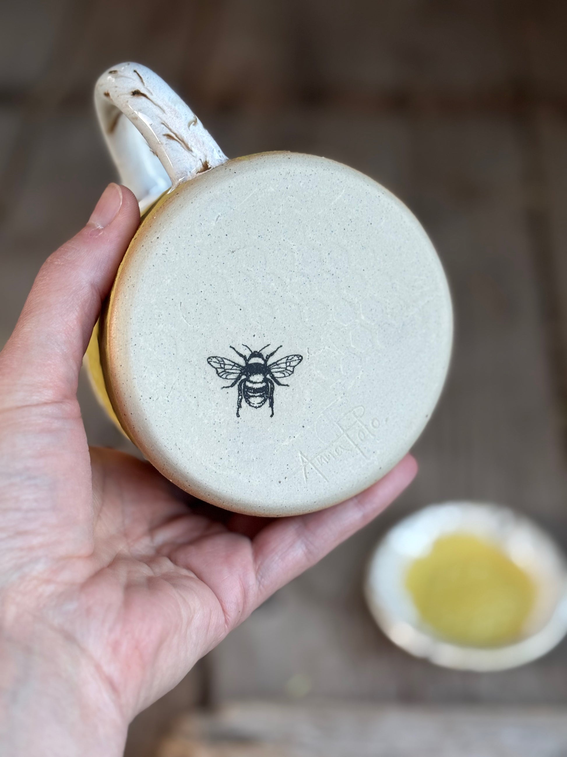 Mug with handle featuring textured honeycomb pattern in warm yellow tones, topped with a glossy white glaze dripping naturally over the edge. Fired at high temperature for durability and dishwasher safe.