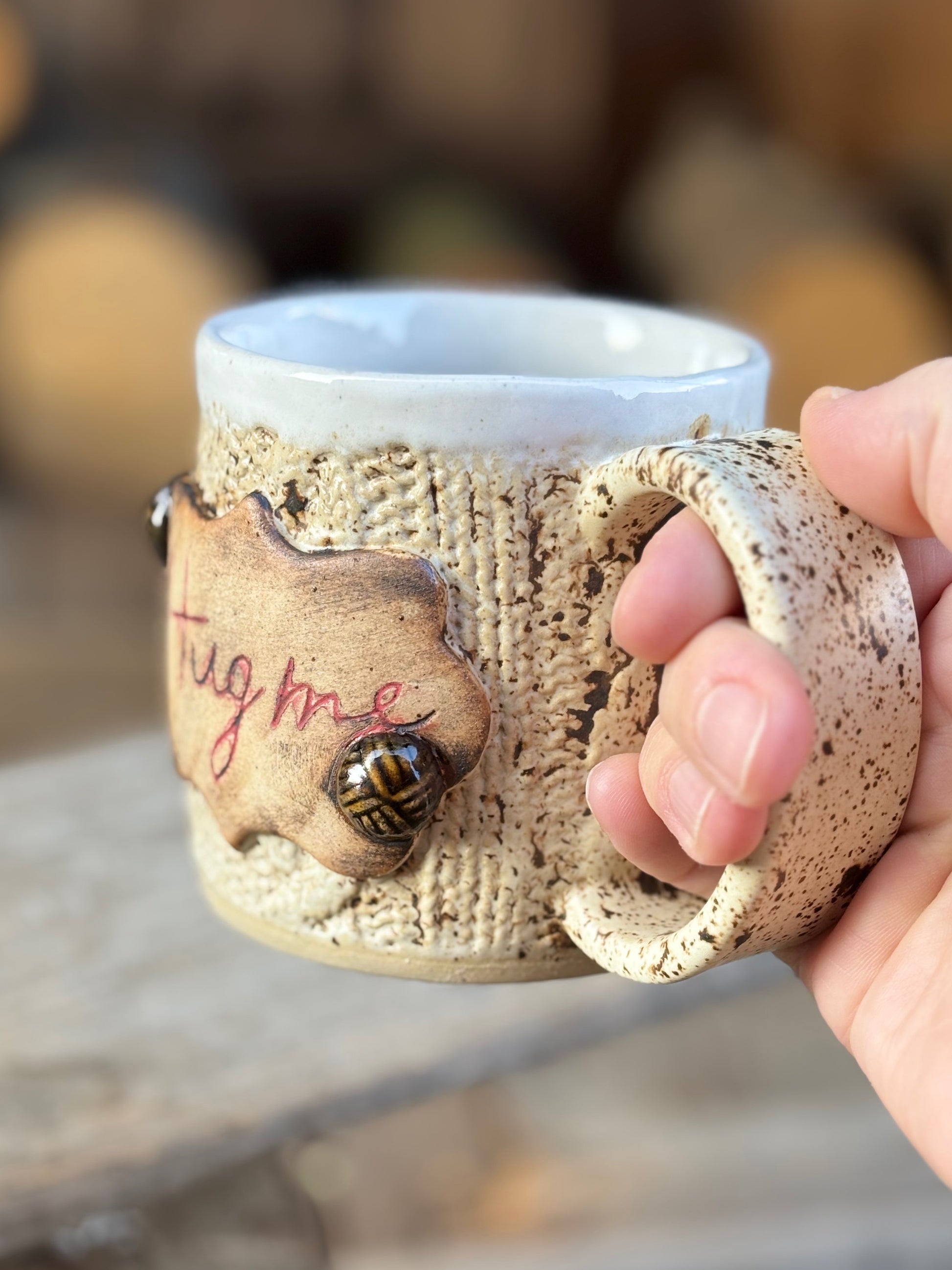 Wrap your hands around this sweater-textured mug, with its playful “Hug me” inscription and button details. A cheerful piece that invites you to pause, smile, and enjoy your favourite drink with warmth.