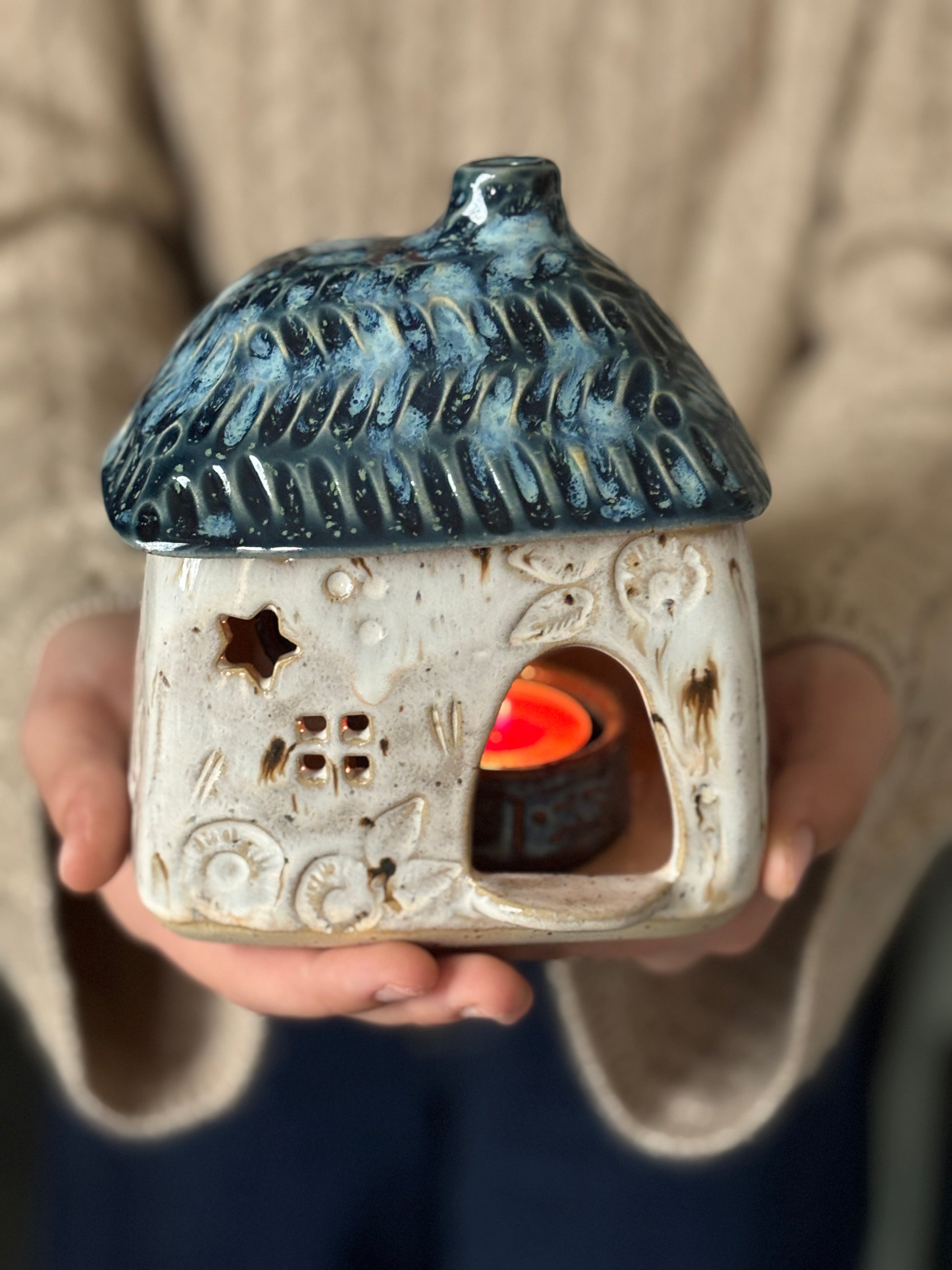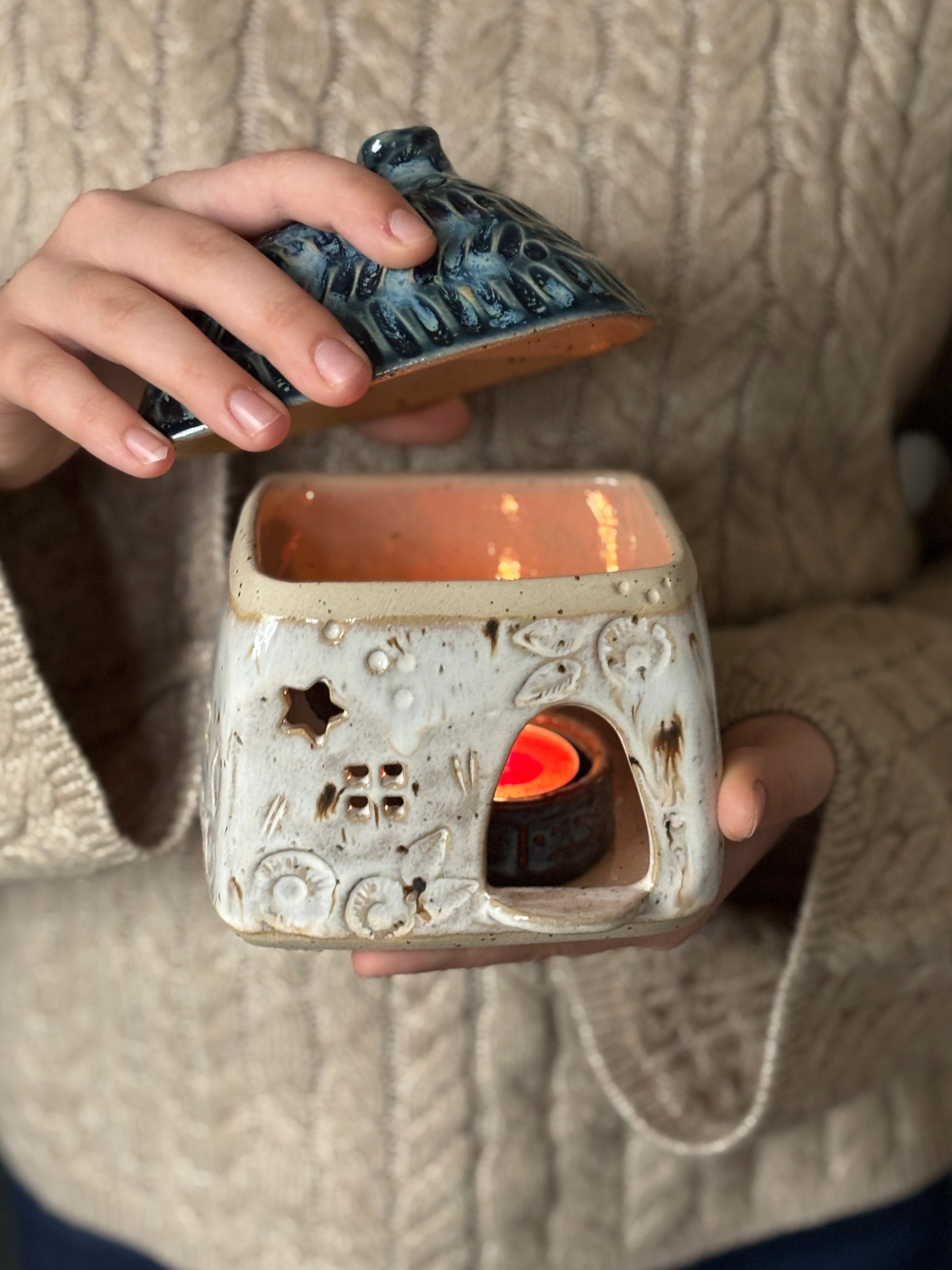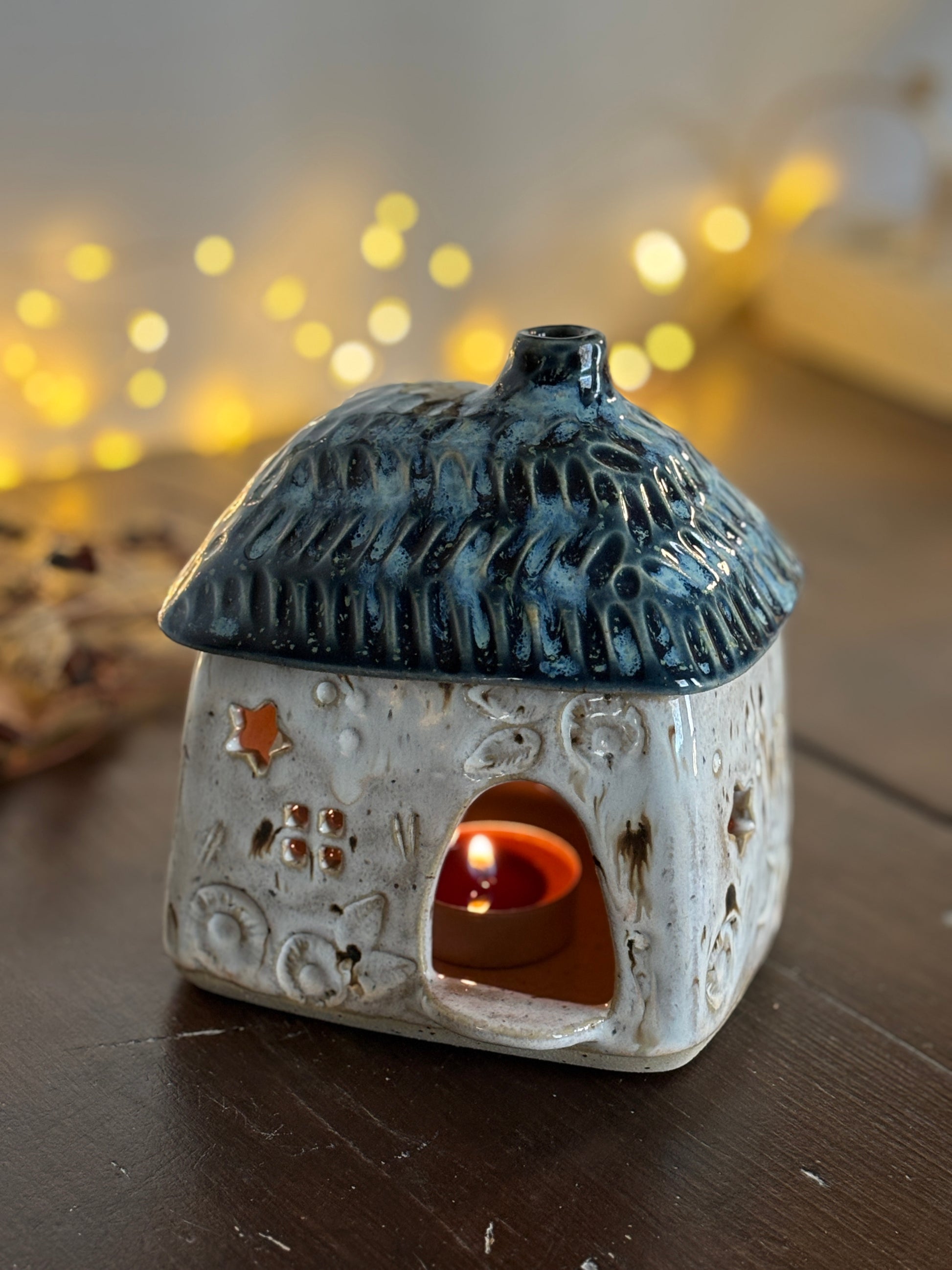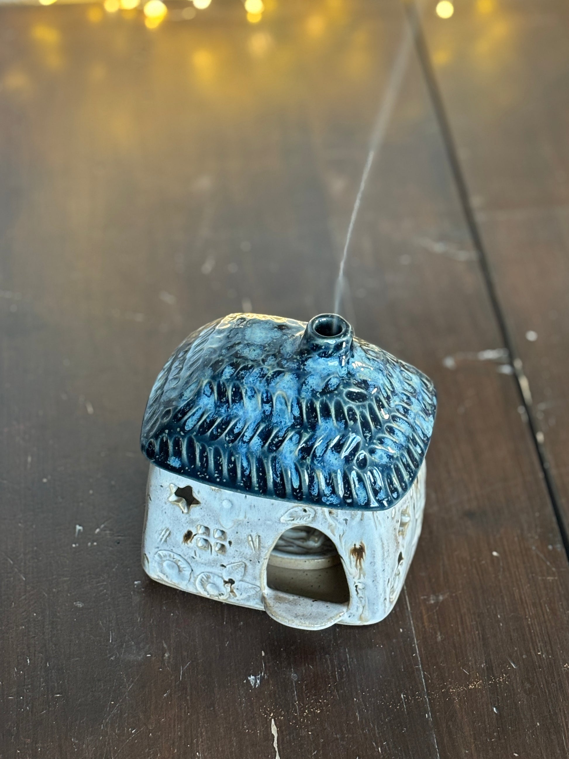 Handmade ceramic house designed for a tealight, incense cone, or scented tree. When lit, the soft glow shines through the windows and gentle smoke escapes through the chimney - like a tiny home glowing in autumn light.