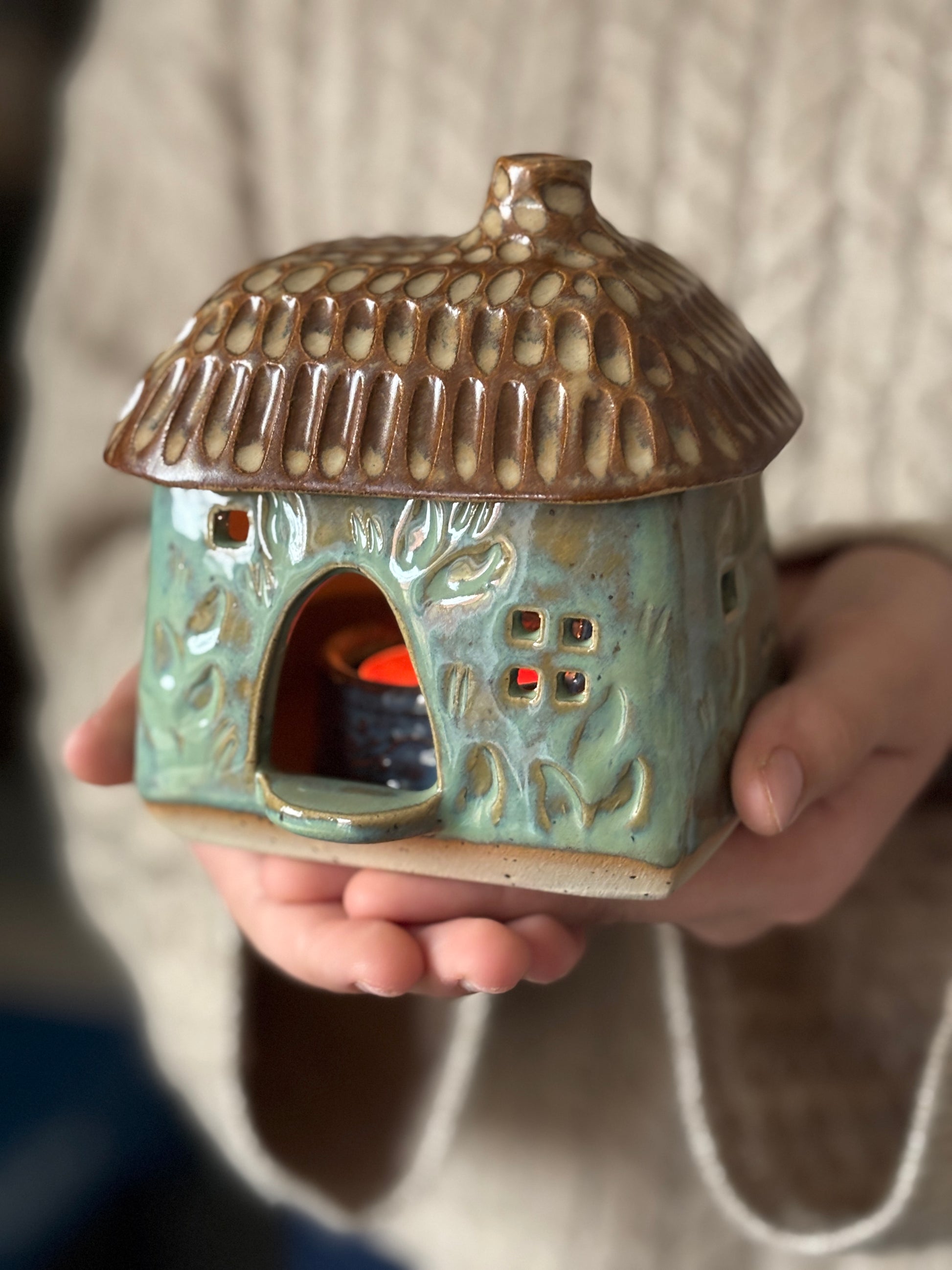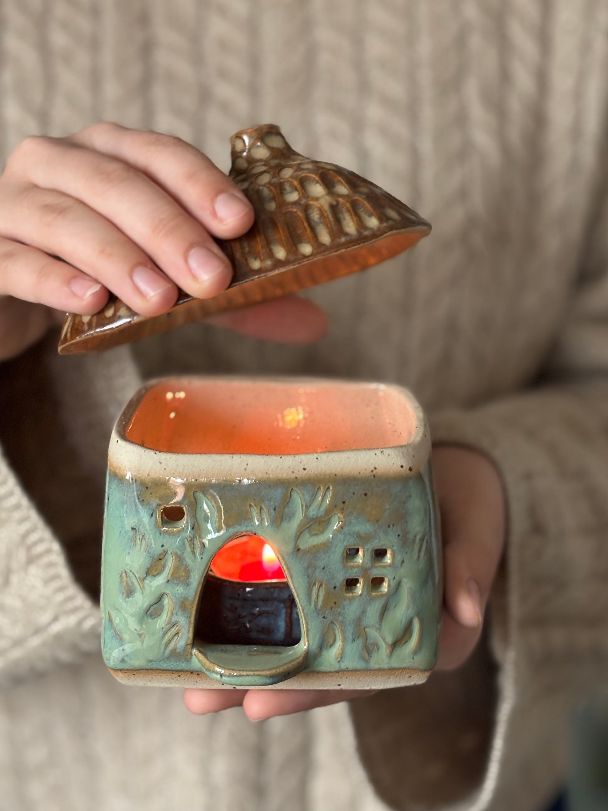 Handmade ceramic house designed for a tealight, incense cone, or scented tree. When lit, the soft glow shines through the windows and gentle smoke escapes through the chimney - like a tiny home hidden in the woods.