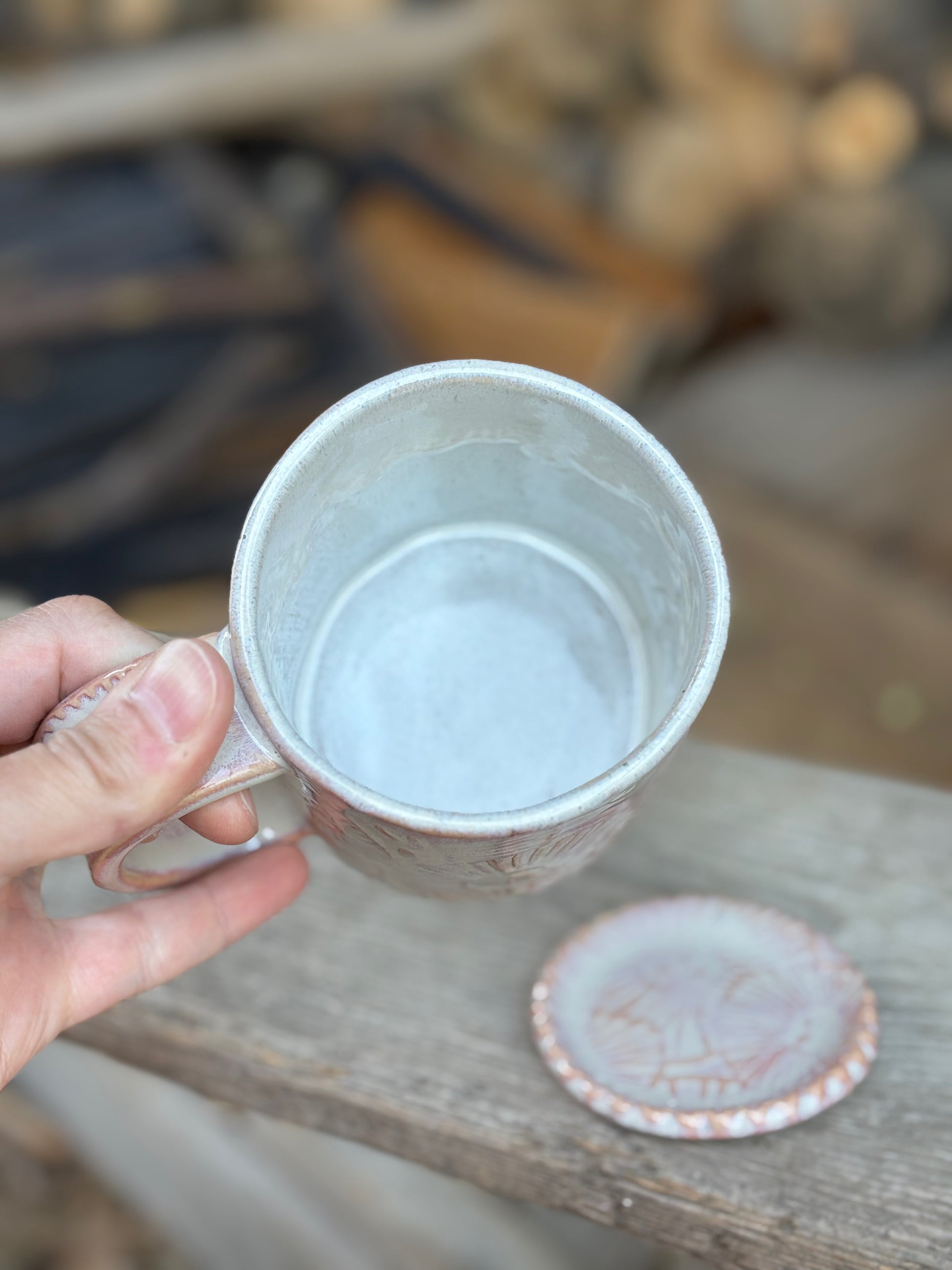 The clay is fired at high temperatures, resulting in a durable and sturdy piece that is both microwave and dishwasher safe. The glaze applied to each mug is lead-free, ensuring a safe drinking experience.